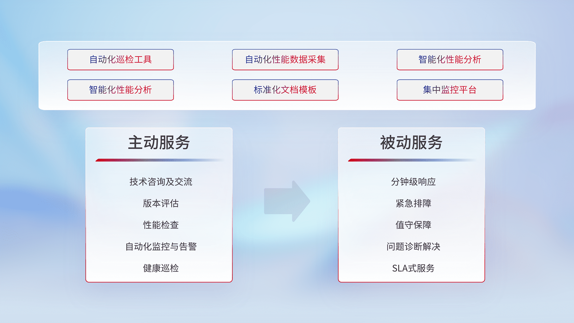 智能化工具和标准化文档,,保障服务质量,,提供主动服务(包含技术咨询、、、、版本评估、、、、性能检查、、、自动化监控与告警、、、、健康巡检)和被动服务包含(分钟级响应、、紧急排障、、值守保障、、、问题诊断解决、、、、SLA服务)。。。